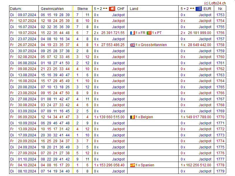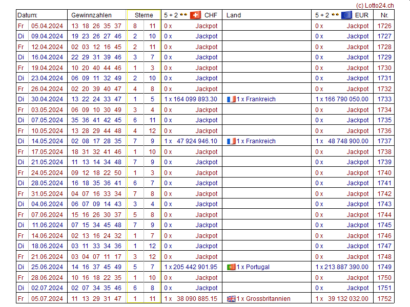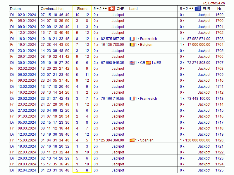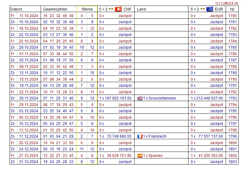 Jahreslisten EuroMillions (EuroMillionen)